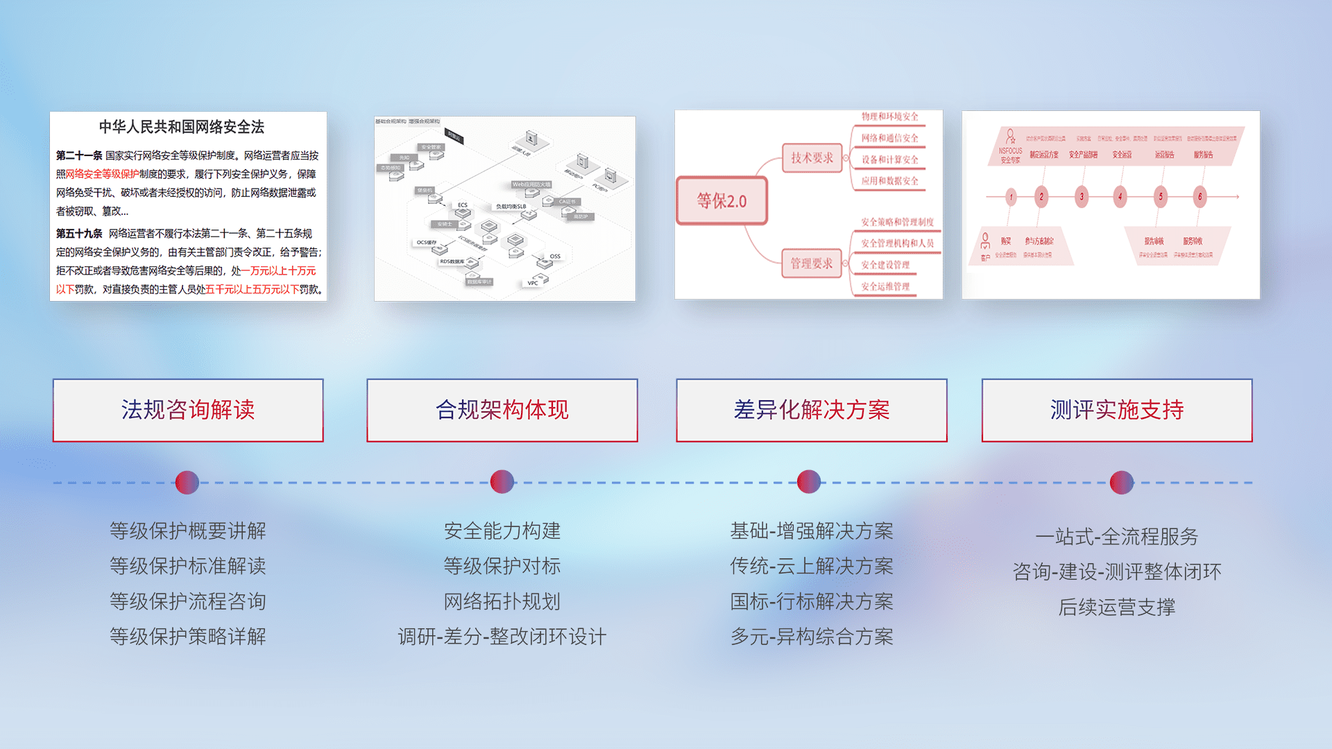 通过专业的法律咨询解读、、合规架构体现、、、、差异化解决方案、、、、测试实施支持等服务,,,,为客户量身打造等保合规体系。。